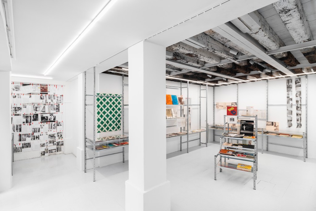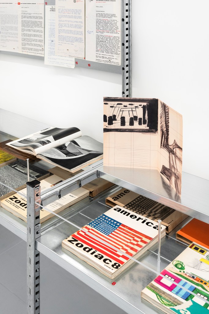 This vision of a “super-magazine” ‒ a constellation of interlinked elements unified by visual and conceptual coherence ‒ is reflected in the exhibition’s design. Standard metal structures frame the chronological narrative of Alfieri’s work, while still allowing for an open, spontaneous experience. Open magazines, suspended documents, and graphic and textual elements are arranged to evoke the very connections and relationships Alfieri sought to create through his publishing practice.