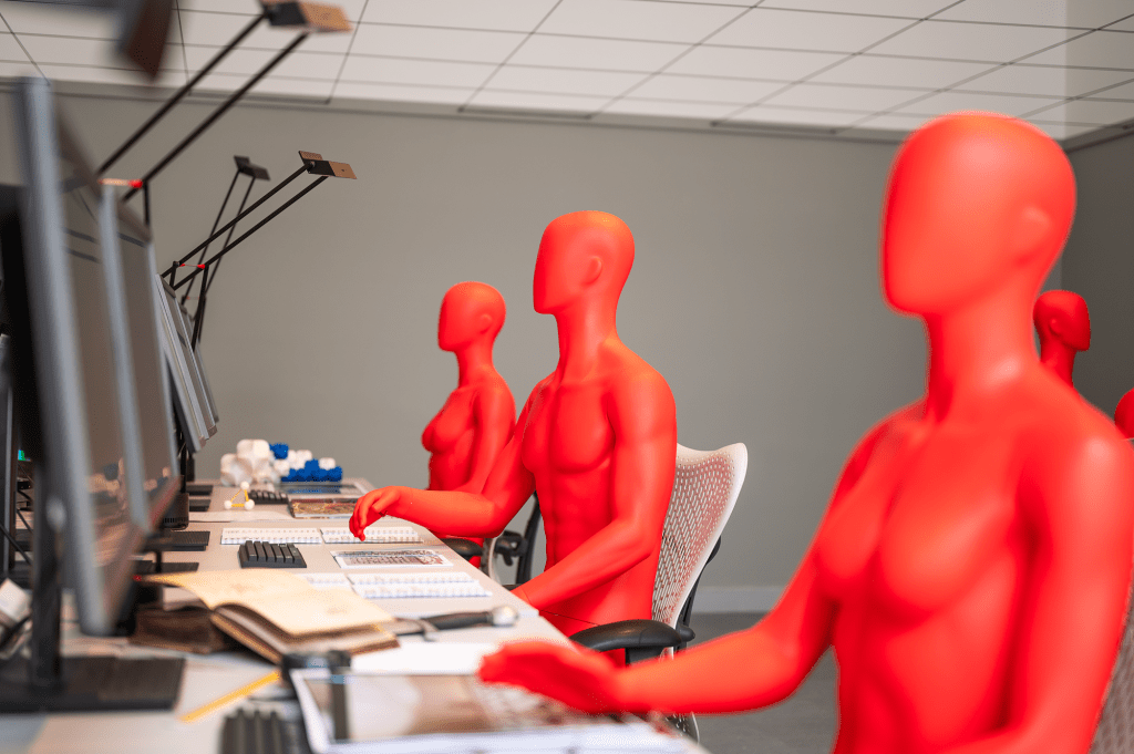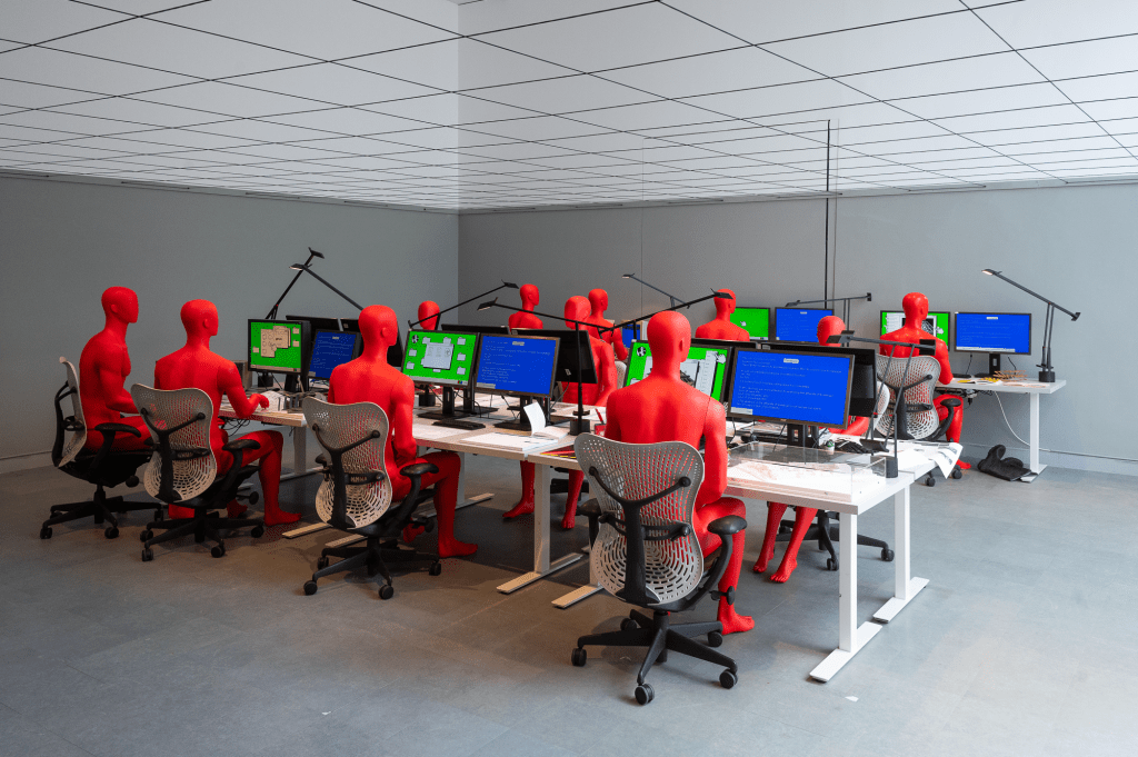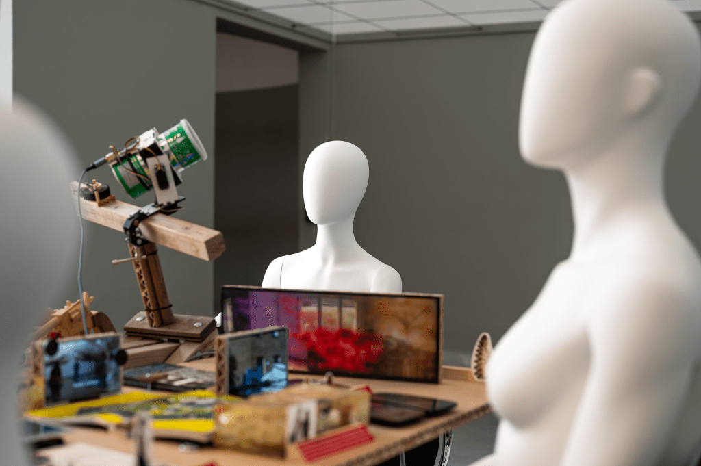 Conceptually speaking, it was an unbelievable coincidence. Can you image what I felt after working on my concept for months already and then in December, 2023 Carlo Ratti is being introduced with his statement of “To face a burning world, architecture must harness all the intelligence around us”. I was all-in. Contextually, however, a statement (like our approach) allows us to ignore the existing exhibition space. The contrast between a classic pavilion and the radical content eventually made the exhibition even better. Talking about challenges… The suspended ceiling imitation is not only a strong set element, but also an essential aspect of the budget cut, as it literally halved the space and therefore lightened our razor-thin budget. The curatorial team also personally helped by waiving our commission fees. Another all-in, but this time quite literally, haha!