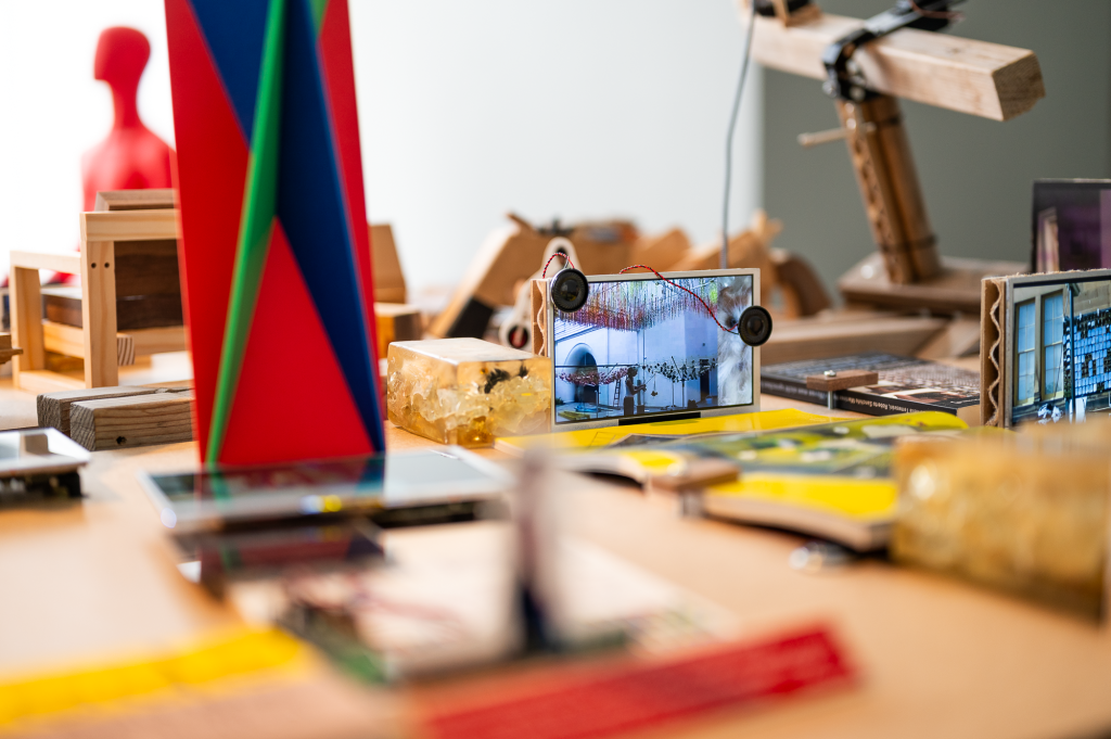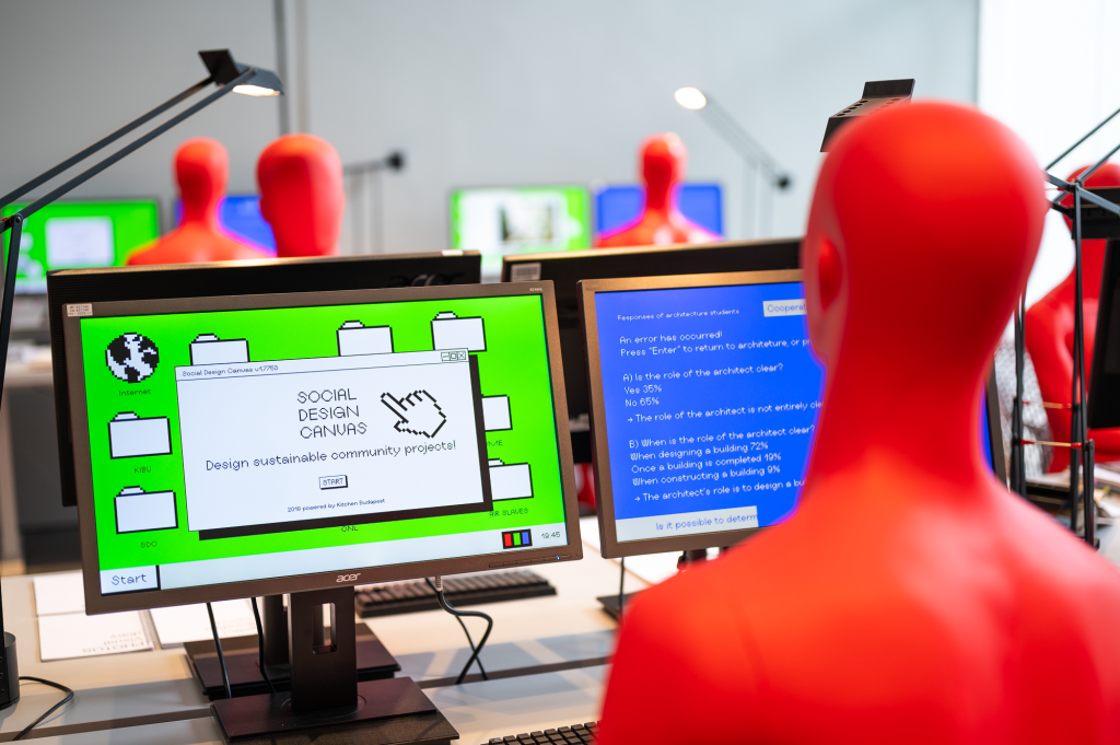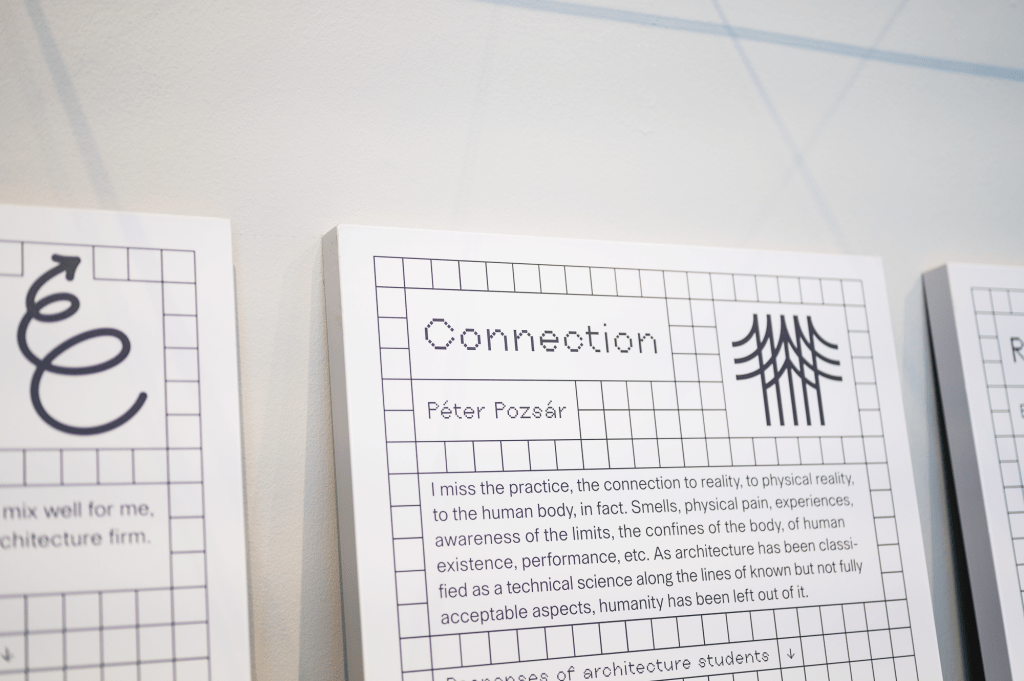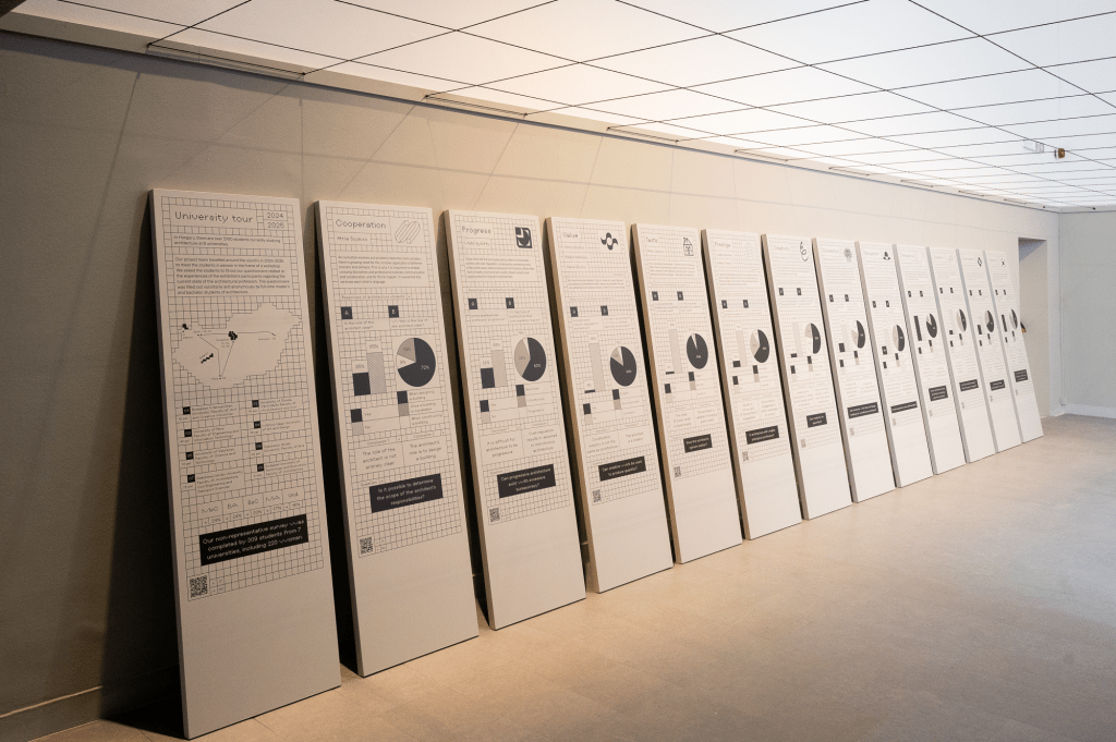 The exhibition’s content is divided into three categories, represented by an RGB color scheme. Red represents the participants, green signifies their successful projects, and blue marks the student reports on the state of architecture collected throughout a survey across Hungarian architecture universities. What is the impact of the blue section?