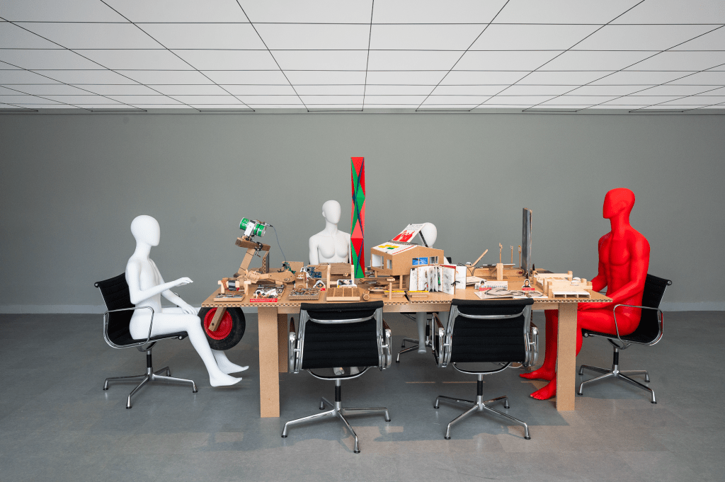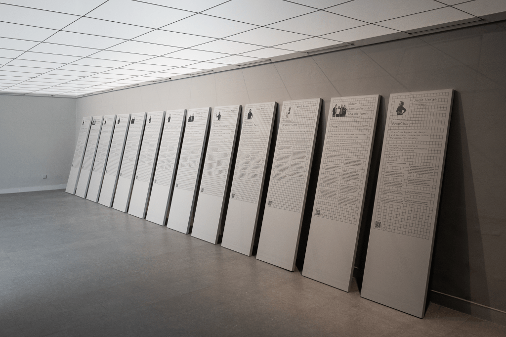 My intention was to create content that is both rich and easy to digest. So, I went for the stereotypical corporate standards for the set and the depressing office activity for the setting. About the arrangement – it went smoothly, there was an immediate common agreement among the exhibitors and the curatorial team on which project goes where: the Somlai-Fischer family takes the “negotiation room”, the copyright kings (Mr. Losonczi and Mr. Rubik) simulating a discussion in the lobby space, the much-respected generational Kaláka music band takes the oval without hesitation and all the other superstars are just enjoying their 9 to 5 at their work stations. What’s more important, though, is that an invisible ingredient to the spatial distribution is the layering. A strong title and scenography can convey the concept in seconds, but you could also spend minutes on just one story.