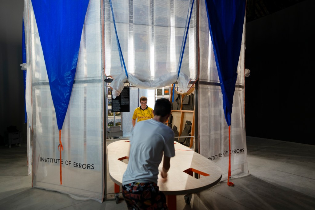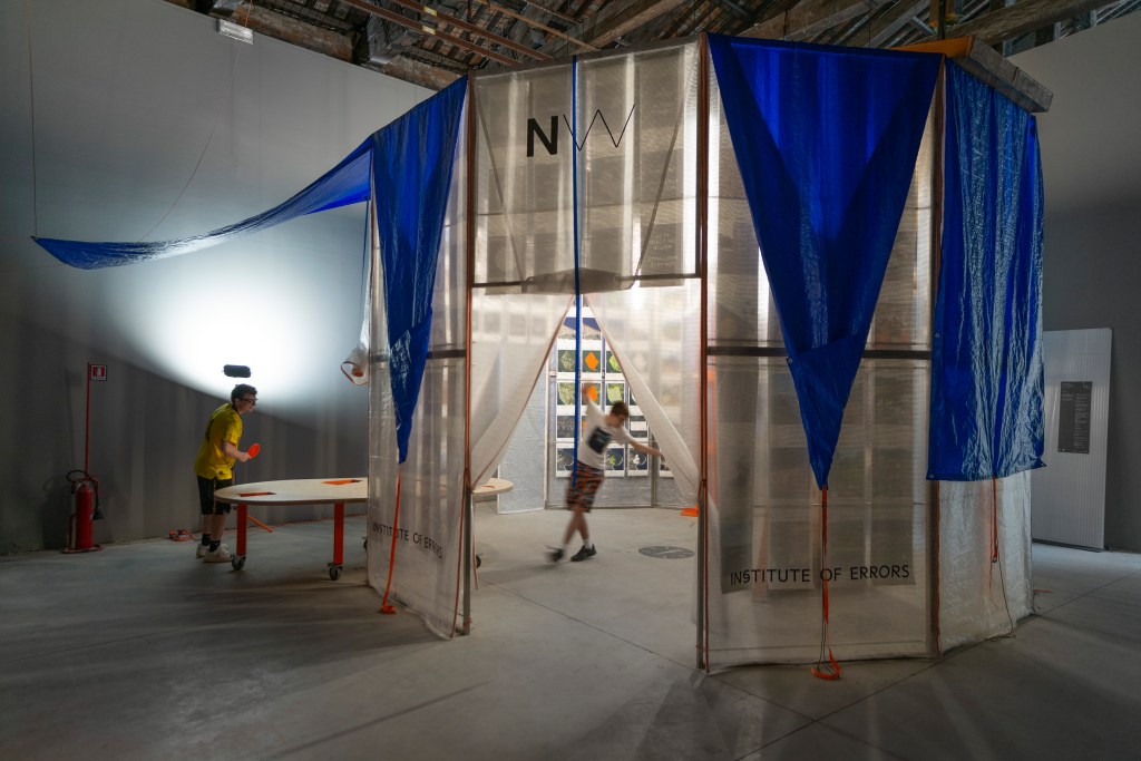 The impossible ping-pong table, a human-powered fan, and a fragment of a roof installation from the 2021 Venice Biennale were designed as interactive objects that illustrate our method of utilizing error to generate new and better worlds ‒ what we call “Error Harvest”. They are independent from the pavilion itself, and in some future iteration we could just as easily imagine creating other imaginariums in their place.