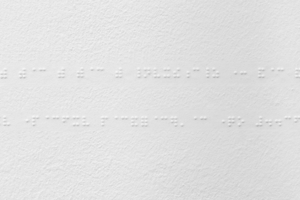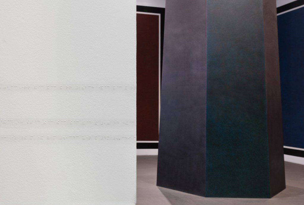 Per voce (2025) is the title of Lydia Ourahmane’s contribution, created in collaboration with her sister Sarah, a musician and composer. At first glance, the work appears imperceptible: only upon approaching the walls does a long Braille score become visible. The composition adapts to the space, its rhythm shaped by the architectural voids ‒ windows and openings ‒ that punctuate three walls. Three blind singers perform by reading the Braille notation, bringing the piece to life through a fusion of body, space, and sound.