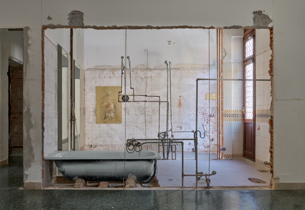 • universe (2025), installation using a washing hanger from a demolished bathroom and found objects, including a water tank, toilet, and Murano glass. Dimensions variable. The work presents a poetic archaeology of abandoned domestic spaces.